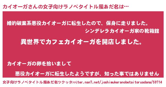 | 男性向けラノベタイトル風あだ名 | 『誰もが恐れるあのカイオーガが、ぼくの専属メイドになるようです。』 |