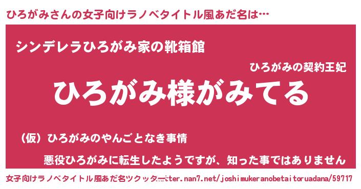 | 男性向けラノベタイトル風あだ名 | 『ひろがみの嫁は女の子じゃないと思った?』 |