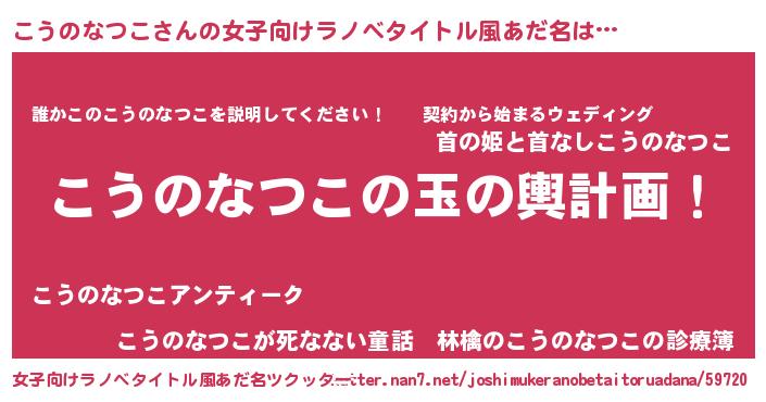 | 男性向けラノベタイトル風あだ名 | 『こうのなつこ~年齢イコール彼女いない歴の魔法使い~』 |