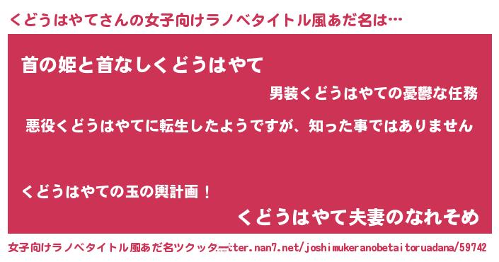 | 男性向けラノベタイトル風あだ名 | 『この素晴らしい世界にくどうはやてを!』 |