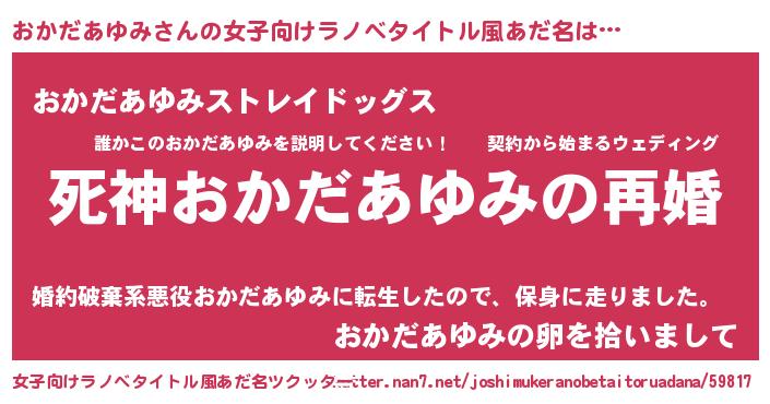 | 伝説のあだ名 | 『救世主となる錬金術士おかだあゆみ』 |
