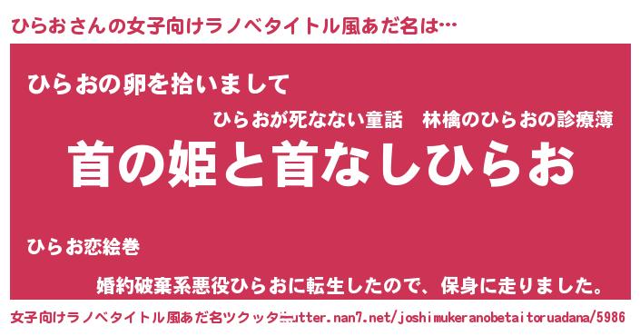 ひらおさんの女子向けラノベタイトル風あだ名は… 『首の姫と首なしひらお』『ひらおの卵を拾いまして』『婚約破棄系悪役ひらおに転生したので、保身に走りました。』 ツクッター #女子向けラノベタイトル風あだ名ツクッター http://tkutter.nan7.net/joshimukeranobetaitoruadana/5986/
