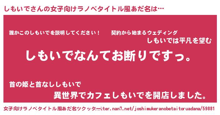 しもいでさんの女子向けラノベタイトル風あだ名は… 『しもいでなんてお断りですっ。』『誰かこのしもいでを説明してください! ~契約から始まるウェディング~』『異世界でカフェしもいでを開店しました。』 ツクッター #女子向けラノベタイトル風あだ名ツクッター http://tkutter.nan7.net/joshimukeranobetaitoruadana/59881/