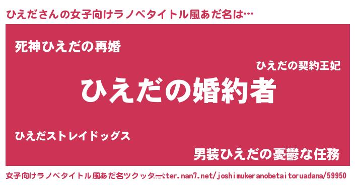 | 男性向けラノベタイトル風あだ名 | 『うちの娘の為ならば、俺はもしかしたらひえだも倒せるかもしれない。』 |