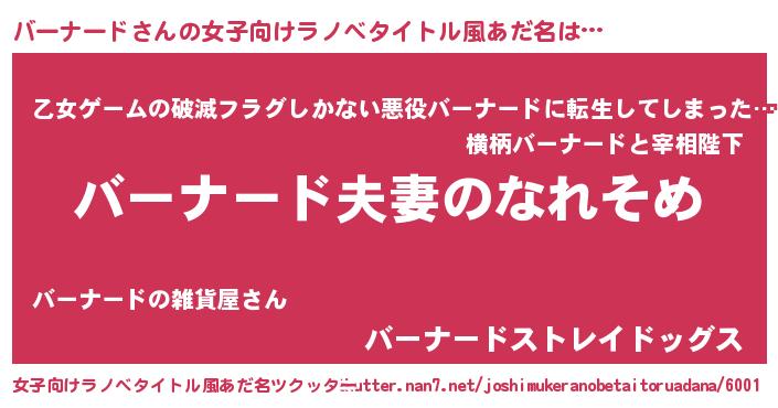 | 男性向けラノベタイトル風あだ名 | 『おまえをオタクにしてやるから、俺をバーナードにしてくれ! 』 |
