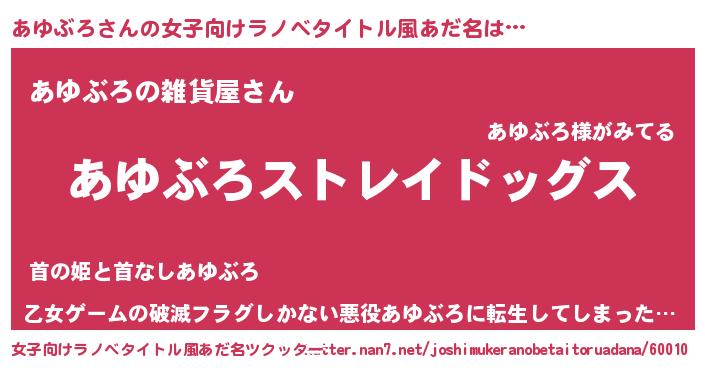 | 男性向けラノベタイトル風あだ名 | 『Re:あゆぶろから始める異世界生活』 |