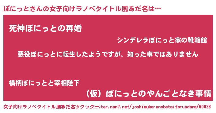 | 男性向けラノベタイトル風あだ名 | 『この素晴らしい世界にぼにっとを!』 |