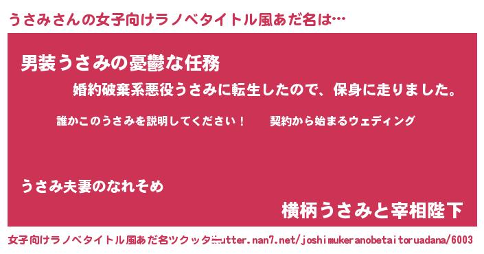 | 男性向けラノベタイトル風あだ名 | 『ウサミアートオンライン』 |
