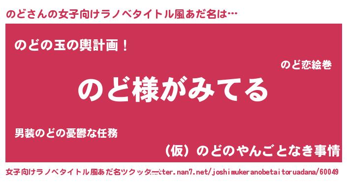 のどさんの女子向けラノベタイトル風あだ名は… 『のど様がみてる』『のどの玉の輿計画!』『(仮)のどのやんごとなき事情』 ツクッター #女子向けラノベタイトル風あだ名ツクッター http://tkutter.nan7.net/joshimukeranobetaitoruadana/60049/