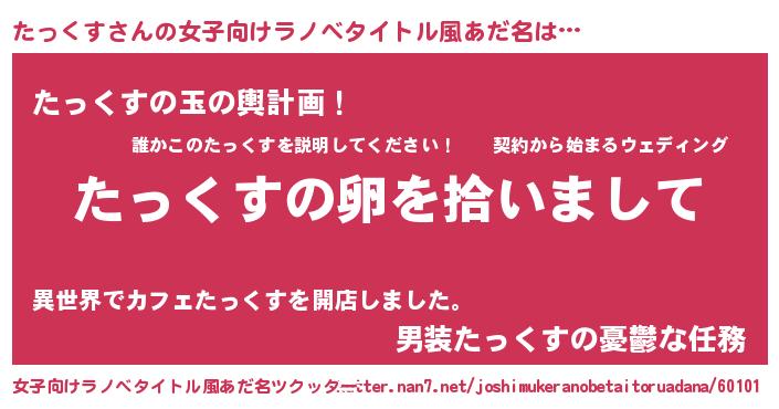 | 男性向けラノベタイトル風あだ名 | 『ダンジョンにたっくすを求めるのは間違っているだろうか』 |