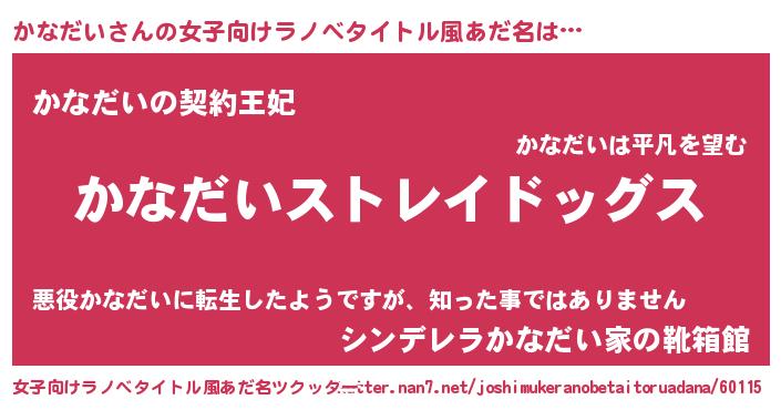| 男性向けラノベタイトル風あだ名 | 『Re:かなだいから始める異世界生活』 |