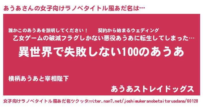 あうあさんの女子向けラノベタイトル風あだ名は… 『異世界で失敗しない100のあうあ』『誰かこのあうあを説明してください! ~契約から始まるウェディング~』『あうあストレイドッグス』 ツクッター #女子向けラノベタイトル風あだ名ツクッター http://tkutter.nan7.net/joshimukeranobetaitoruadana/60128/