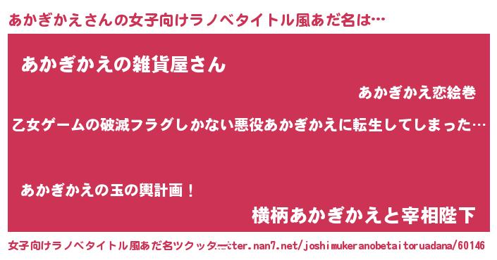 | 男性向けラノベタイトル風あだ名 | 『この素晴らしい世界にあかぎかえを!』 |