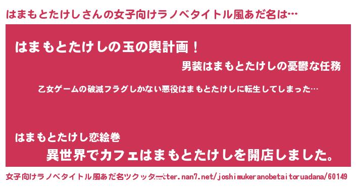 | 男性向けラノベタイトル風あだ名 | 『この素晴らしい世界にはまもとたけしを!』 |