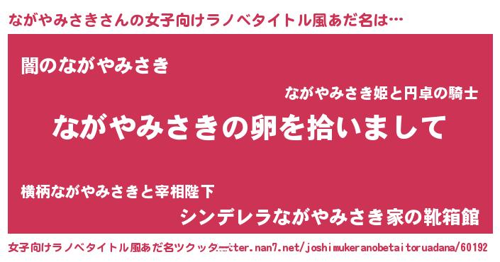| 男性向けラノベタイトル風あだ名 | 『ながやみさきの嫁は女の子じゃないと思った?』 |