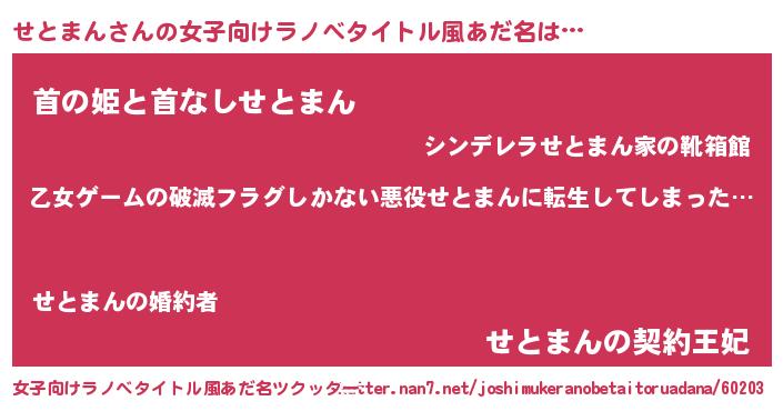 | 男性向けラノベタイトル風あだ名 | 『この素晴らしい世界にせとまんを!』 |