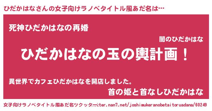 | 男性向けラノベタイトル風あだ名 | 『ひだかはな~年齢イコール彼女いない歴の魔法使い~』 |