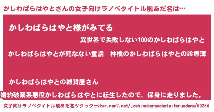 | 意味不明あだ名 | 『住所不定無職かしわばらはやと(93歳)』 |