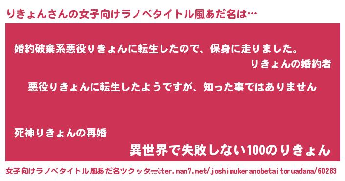 | 男性向けラノベタイトル風あだ名 | 『この素晴らしい世界にりきょんを!』 |