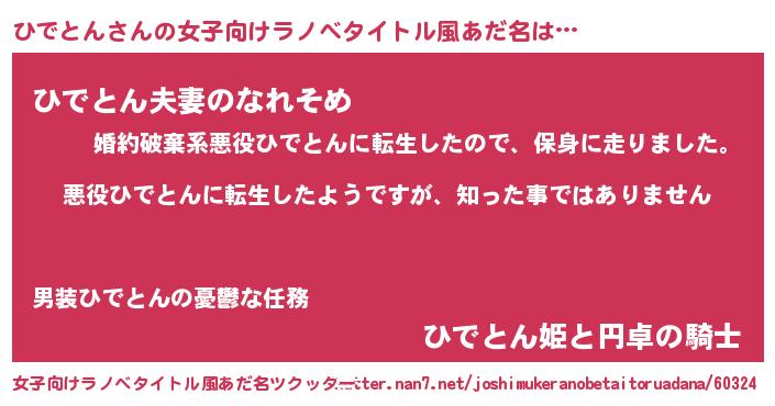 | 男性向けラノベタイトル風あだ名 | 『この素晴らしい世界にひでとんを!』 |