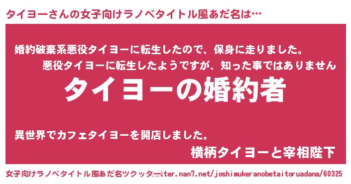 | 男性向けラノベタイトル風あだ名 | 『うちの娘の為ならば、俺はもしかしたらタイヨーも倒せるかもしれない。』 |