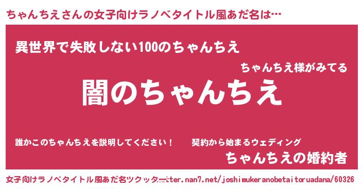 | 男性向けラノベタイトル風あだ名 | 『Re:ちゃんちえから始める異世界生活』 |