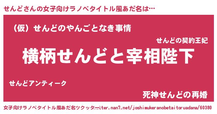 | 男性向けラノベタイトル風あだ名 | 『せんどに滅ぼされるだけの簡単なお仕事です』 |