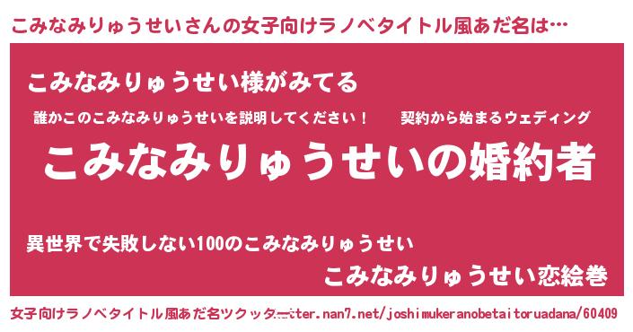 こみなみりゅうせいさんの女子向けラノベタイトル風あだ名は… 『こみなみりゅうせいの婚約者』『こみなみりゅうせい様がみてる』『こみなみりゅうせい恋絵巻』 ツクッター #女子向けラノベタイトル風あだ名ツクッター http://tkutter.nan7.net/joshimukeranobetaitoruadana/60409/