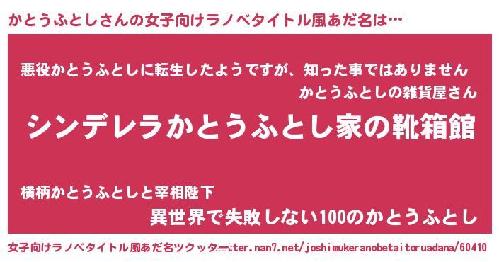 かとうふとしさんの女子向けラノベタイトル風あだ名は… 『シンデレラかとうふとし家の靴箱館』『悪役かとうふとしに転生したようですが、知った事ではありません』『異世界で失敗しない100のかとうふとし』 ツクッター #女子向けラノベタイトル風あだ名ツクッター http://tkutter.nan7.net/joshimukeranobetaitoruadana/60410/