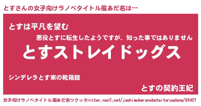 | 男性向けラノベタイトル風あだ名 | 『Re:とすから始める異世界生活』 |