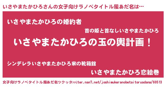 | 男性向けラノベタイトル風あだ名 | 『転生したらいさやまたかひろだった件』 |