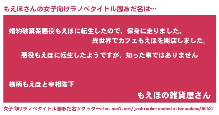 | 男性向けラノベタイトル風あだ名 | 『この素晴らしい世界にもえほを!』 |