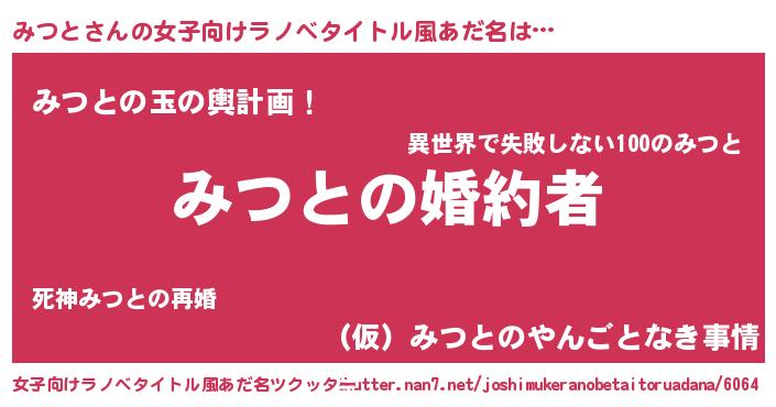 | 男性向けラノベタイトル風あだ名 | 『うちの娘の為ならば、俺はもしかしたらみつとも倒せるかもしれない。』 |