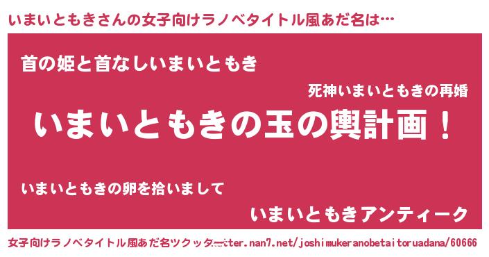 | 男性向けラノベタイトル風あだ名 | 『いまいともき~年齢イコール彼女いない歴の魔法使い~』 |