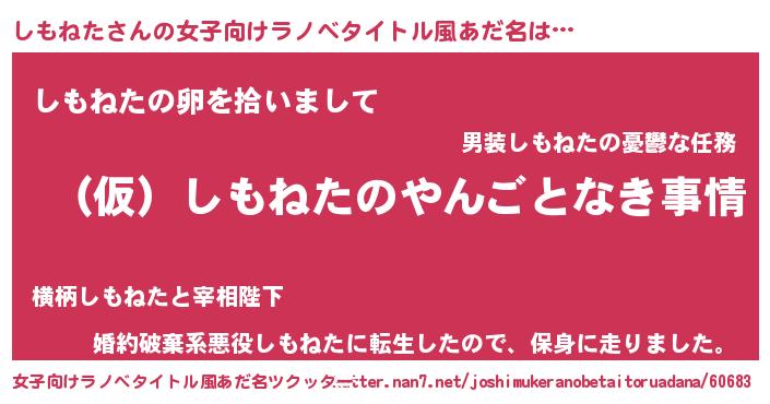しもねたさんの女子向けラノベタイトル風あだ名は… 『(仮)しもねたのやんごとなき事情』『しもねたの卵を拾いまして』『婚約破棄系悪役しもねたに転生したので、保身に走りました。』 ツクッター #女子向けラノベタイトル風あだ名ツクッター http://tkutter.nan7.net/joshimukeranobetaitoruadana/60683/