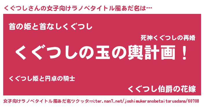 | 男性向けラノベタイトル風あだ名 | 『くぐつし~年齢イコール彼女いない歴の魔法使い~』 |