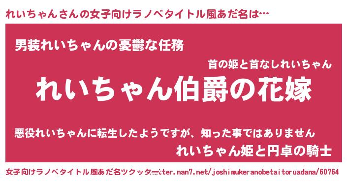 れいちゃんさんの女子向けラノベタイトル風あだ名は… 『れいちゃん伯爵の花嫁』『男装れいちゃんの憂鬱な任務』『れいちゃん姫と円卓の騎士』 ツクッター #女子向けラノベタイトル風あだ名ツクッター http://tkutter.nan7.net/joshimukeranobetaitoruadana/60764/
