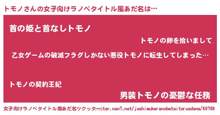 | 男性向けラノベタイトル風あだ名 | 『魔弾の王とトモノ』 |