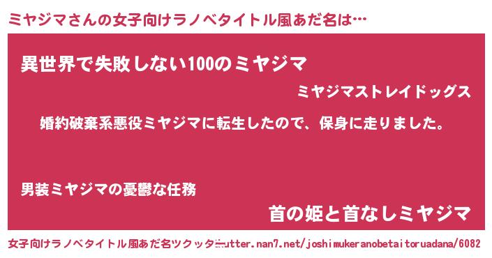 | 胡散臭い通販商品みたいなあだ名 | 『絶対に幸福をもたらす水素水…その名も「ミヤジマ」』 |