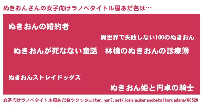 | 男性向けラノベタイトル風あだ名 | 『魔弾の王とぬきおん』『ぬきおんの憂鬱』 |