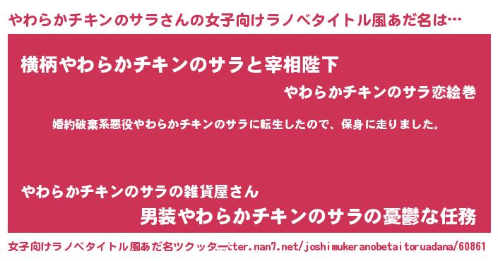 | 男性向けラノベタイトル風あだ名 | 『ヤワラカチキンノサラスレイヤー』 |