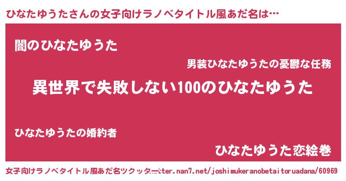 ひなたゆうたさんの女子向けラノベタイトル風あだ名は… 『異世界で失敗しない100のひなたゆうた』『闇のひなたゆうた』『ひなたゆうた恋絵巻』 ツクッター #女子向けラノベタイトル風あだ名ツクッター http://tkutter.nan7.net/joshimukeranobetaitoruadana/60969/