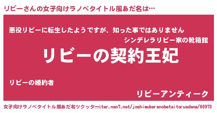 リビーさんの女子向けラノベタイトル風あだ名は… 『リビーの契約王妃』『悪役リビーに転生したようですが、知った事ではありません』『リビーアンティーク』 ツクッター #女子向けラノベタイトル風あだ名ツクッター http://tkutter.nan7.net/joshimukeranobetaitoruadana/60973/