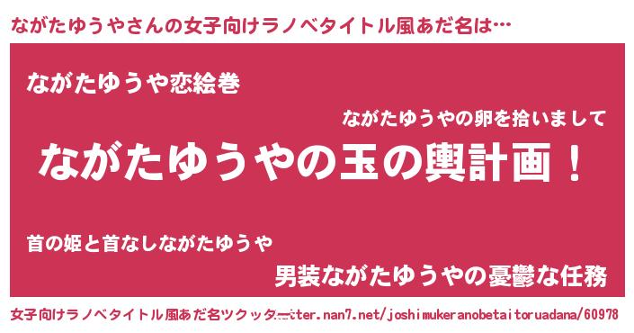 | 男性向けラノベタイトル風あだ名 | 『ながたゆうや~年齢イコール彼女いない歴の魔法使い~』 |