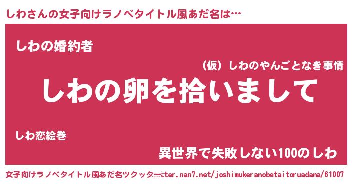 | 男性向けラノベタイトル風あだ名 | 『しわの嫁は女の子じゃないと思った?』 |