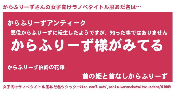 からふりーずさんの女子向けラノベタイトル風あだ名は… 『からふりーず様がみてる』『からふりーずアンティーク』『首の姫と首なしからふりーず』 ツクッター #女子向けラノベタイトル風あだ名ツクッター http://tkutter.nan7.net/joshimukeranobetaitoruadana/61009/