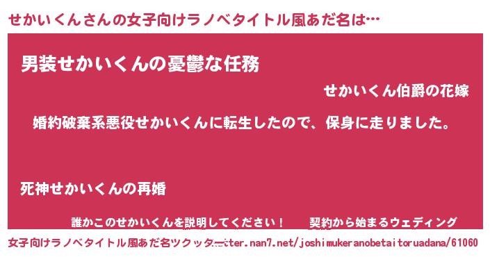 | 男性向けラノベタイトル風あだ名 | 『セカイクンスレイヤー』 |
