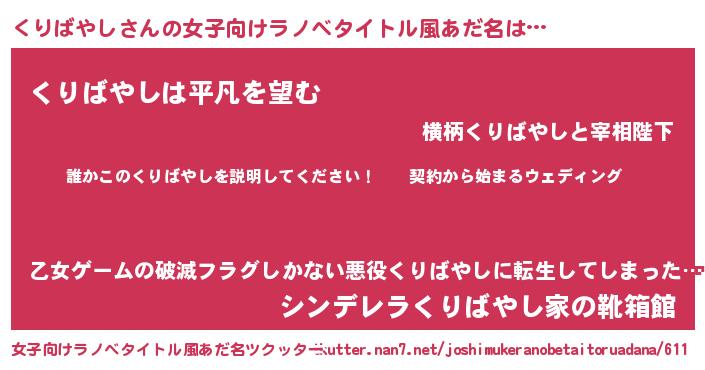 くりばやしさんの女子向けラノベタイトル風あだ名は… 『誰かこのくりばやしを説明してください! ~契約から始まるウェディング~』『くりばやしは平凡を望む』『シンデレラくりばやし家の靴箱館』 ツクッター #女子向けラノベタイトル風あだ名ツクッター http://tkutter.nan7.net/joshimukeranobetaitoruadana/611/