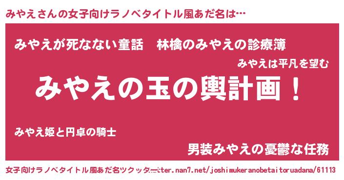 | 男性向けラノベタイトル風あだ名 | 『転生したらみやえだった件』 |