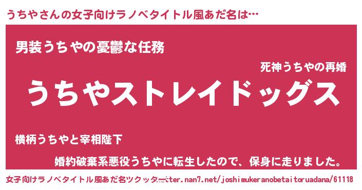 | 男性向けラノベタイトル風あだ名 | 『Re:うちやから始める異世界生活』 |